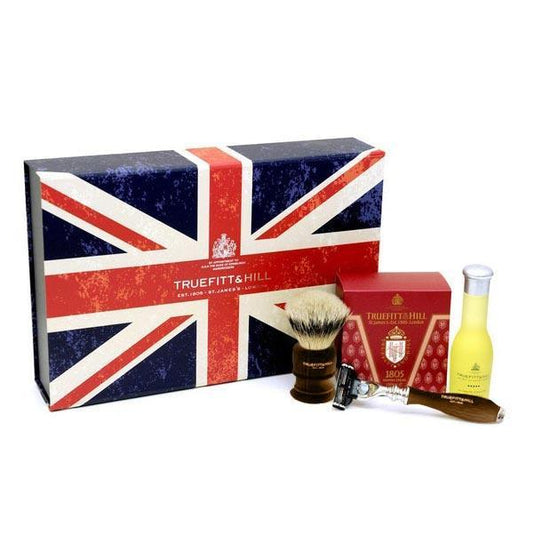 The Essential Shaving Kit: - One Wellington Mach III Razor - One Wellington Shaving Brush - One Pre-Shave Oil (100ml) - One Shaving Cream Bowl (190g) - Union Jack Gift Box (Free)Please select your choice for the colour of Razor & Brush, and also the fragrance of Shaving Cream Bowl.